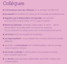 Il est notamment important de communiquer avec eux sur le principe du télétravail, de les former aux outils collaboratifs et de les sensibiliser sur le fait que les télétravailleurs sont bien présents au travail, même si à distance. Afin de ne pas se créer de surcharge de travail, les collègues doivent les solliciter normalement et ne pas répondre à leur place mais leur rediriger les demandes qui les concernent.